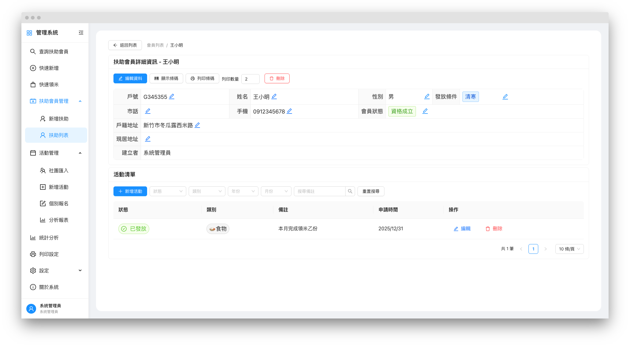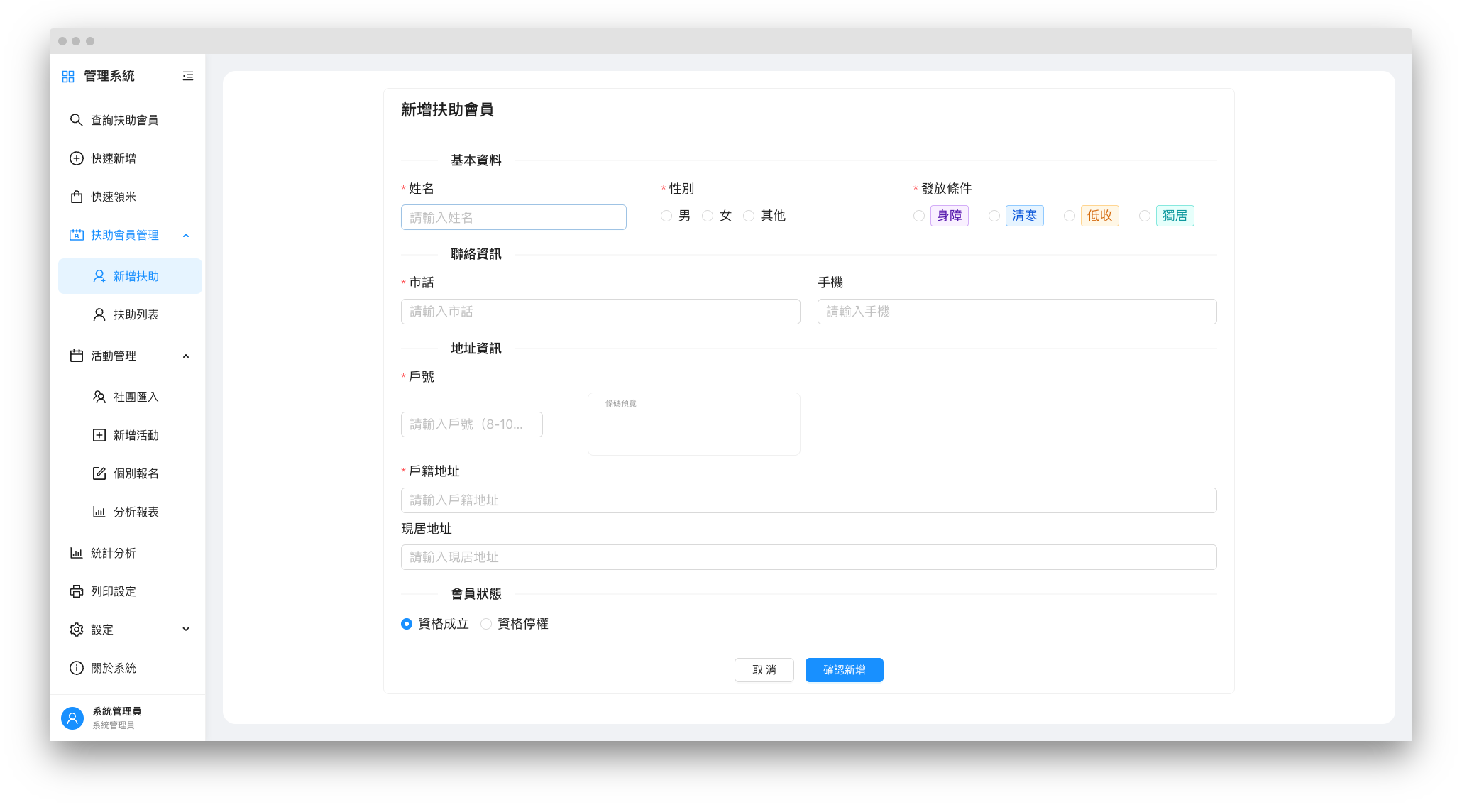 需要完整建檔時,可透過標準表單錄入會員的基本資料、聯絡資訊、地址與發放條件(身障、清寒、低收、獨居)。系統自動關聯戶號,確保資料一致性。