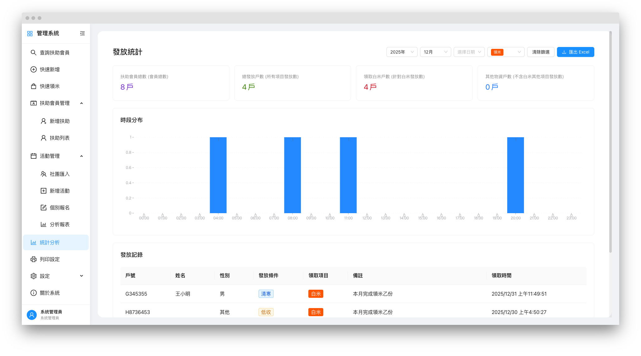 管理後台提供完整的統計儀表板:扶助會員總數、應發放戶數、實際領取白米戶數一目瞭然。搭配時段分布圖表與詳細發放紀錄,支援按月份、日期、類別篩選,並可匯出 Excel 供後續核銷使用。
